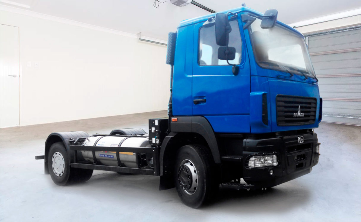 Шасси автомобильное (автомобиль без платформы) 534023-525-013 с колесной формулой 4х2 экологического класса Евро-5, с двигателем работающем на компримированном топливе (на сжатом природном газе) с установкой газовых баллонов производства РФ. Шасси МАЗ 534023 предназначен для установки мусоровозного (или другого) оборудования.