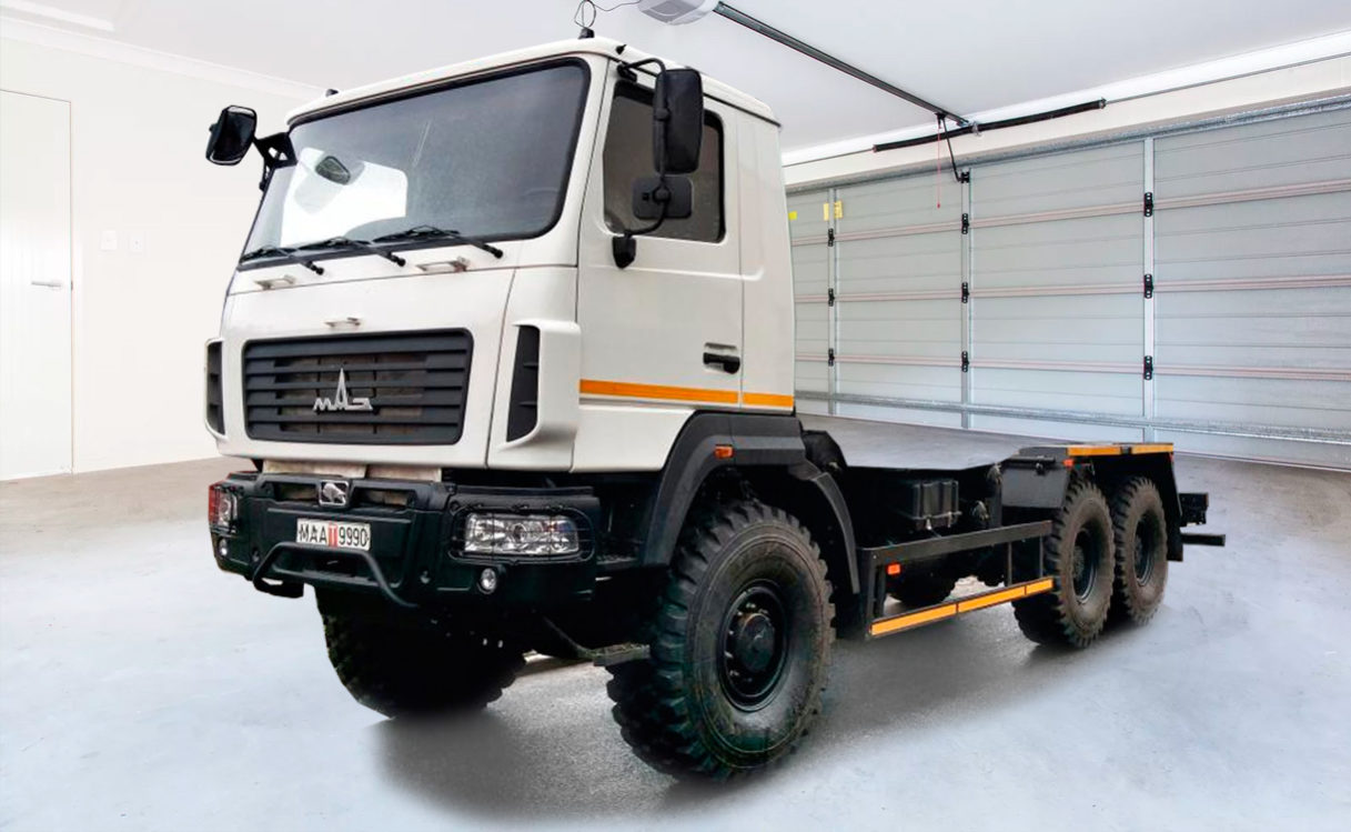 Полноприводный автомобиль без платформы (шасси) МАЗ 6302 с уменьшенной снаряженной массой и пониженной установкой кабины (кабина без люка, с подштамповкой в центральной часи) предназначен под установку различных специальных надстроек и для перевозки различных грузов.